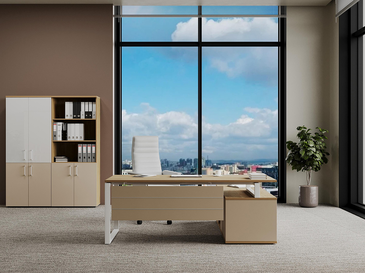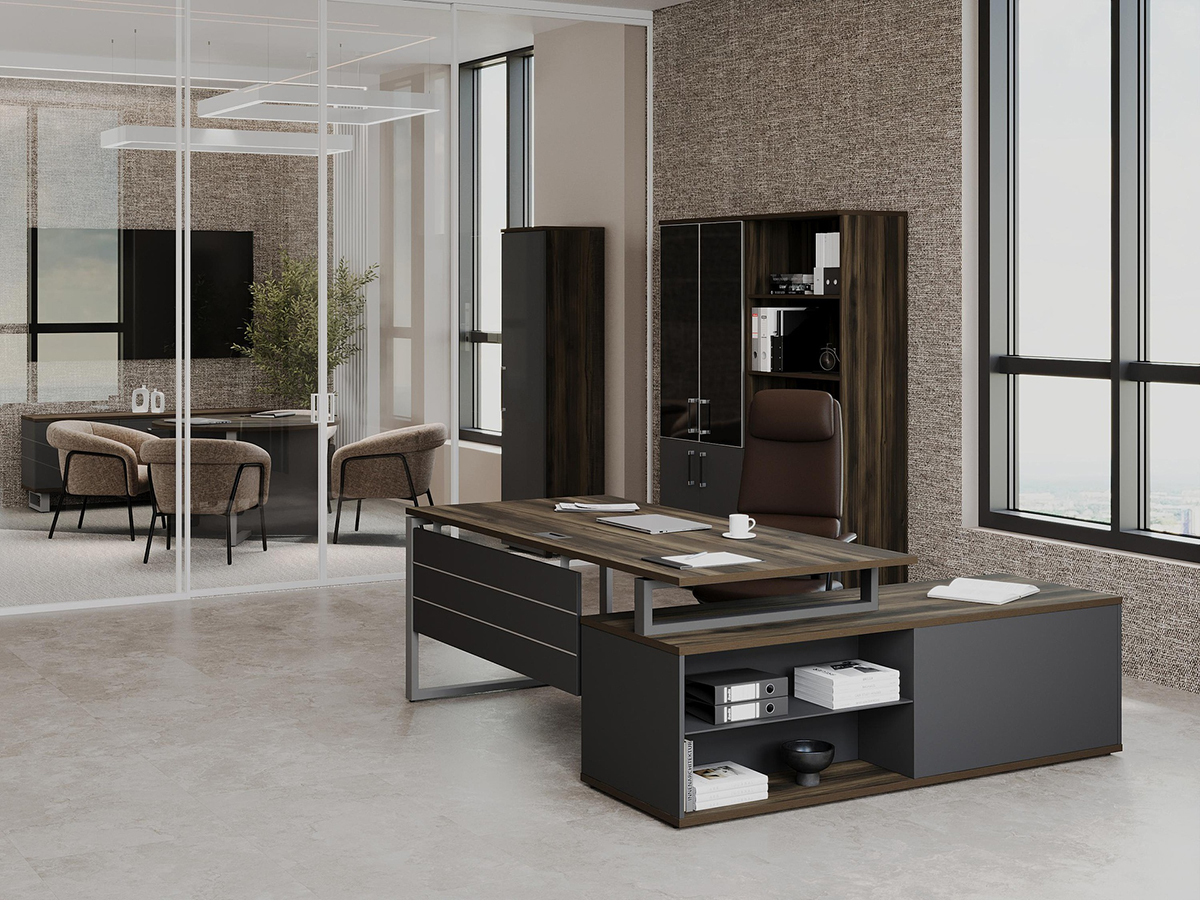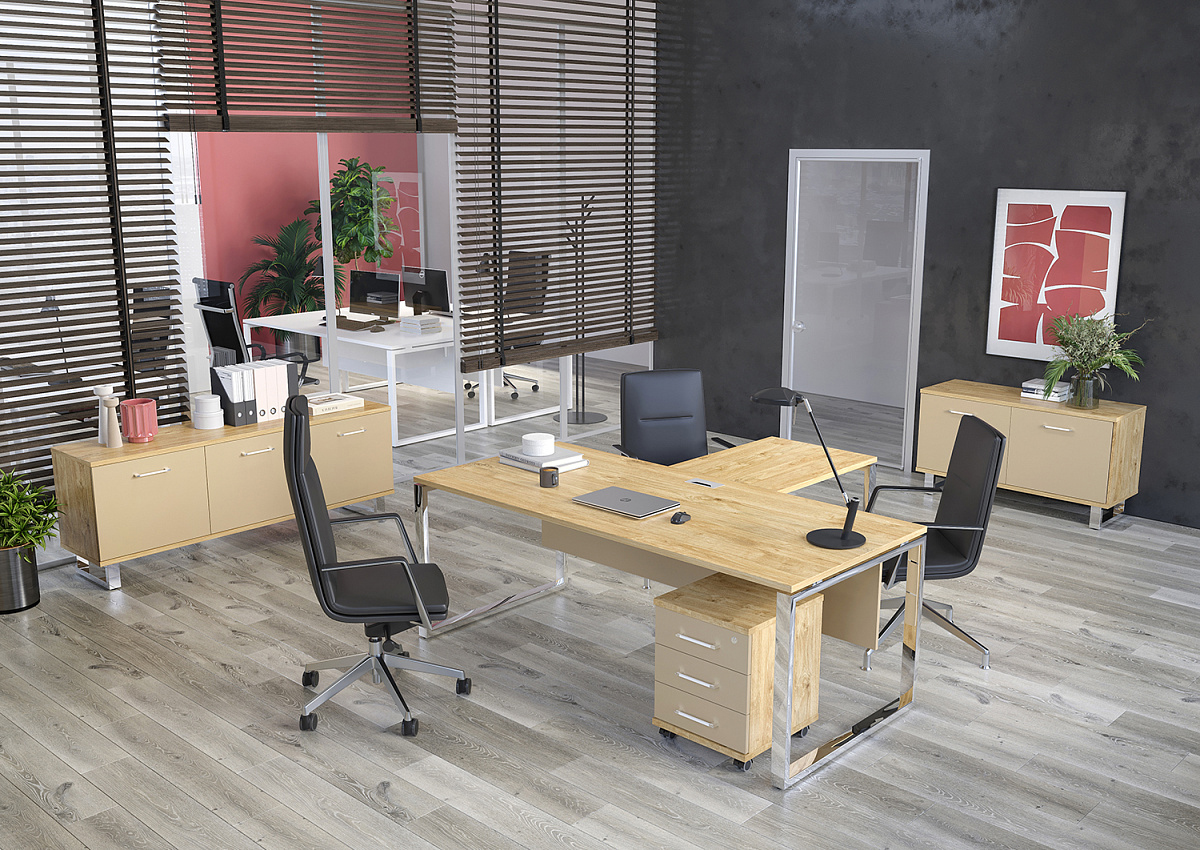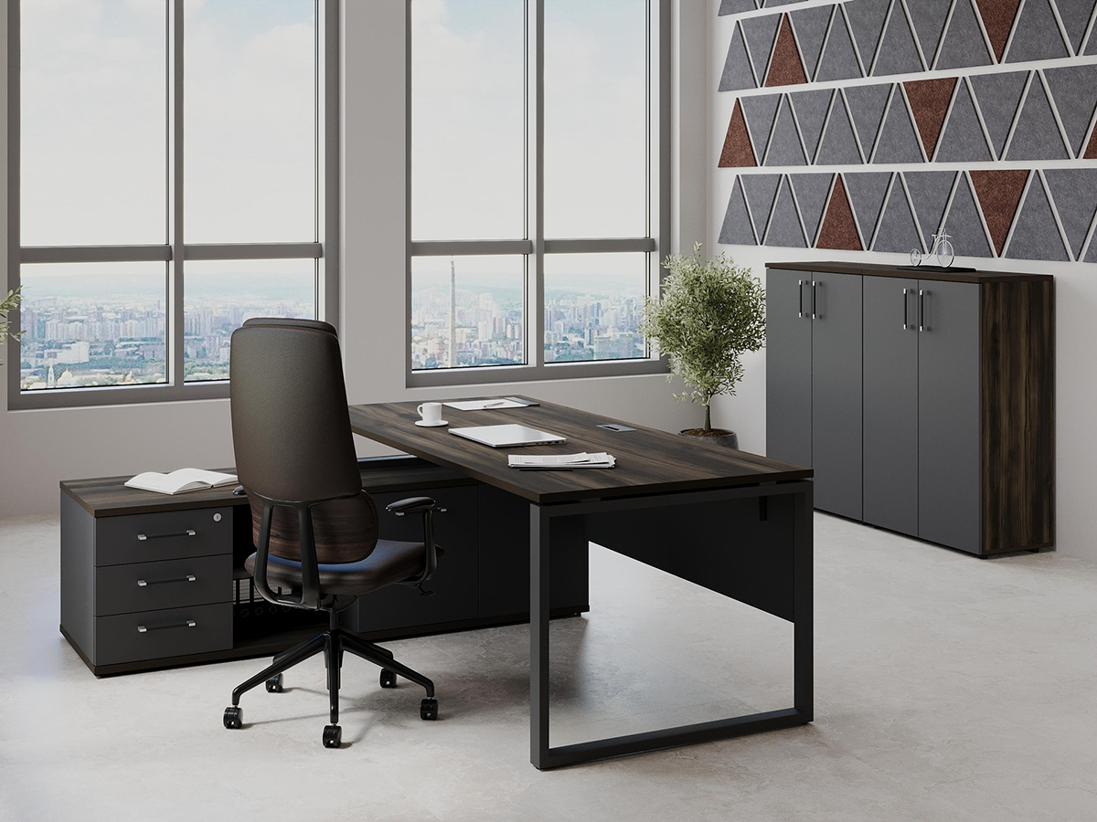 - Столешница прямоугольной формы изготовлена из ЛДСП толщиной 25мм, торцы облицованы по периметру кромкой ПВХ толщиной 2мм в цвет ЛДСП. Столешница крепится к траверсам винтами. Столешница приподнята над боковой опорой на 10 мм за счет набалдашников металлических траверс. В столешнице присутствует технологическое отверстие для установки заглушки кабель-канала размером 160;