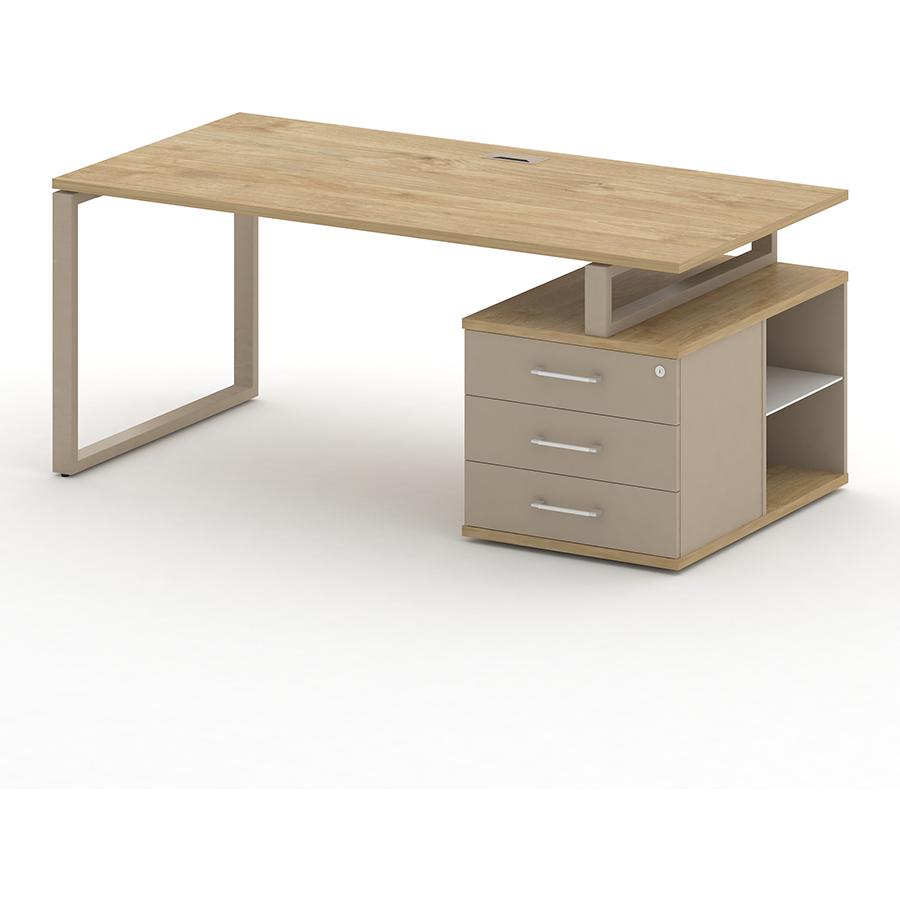 - Столешница прямоугольной формы изготовлена из ЛДСП толщиной 25мм, торцы облицованы по периметру кромкой ПВХ толщиной 2мм в цвет ЛДСП. Столешница крепится к траверсам винтами. Столешница приподнята над боковой опорой на 10 мм за счет декоративных металлических проставок. В столешнице присутствует технологическое отверстие для установки заглушки кабель-канала размером 160;
