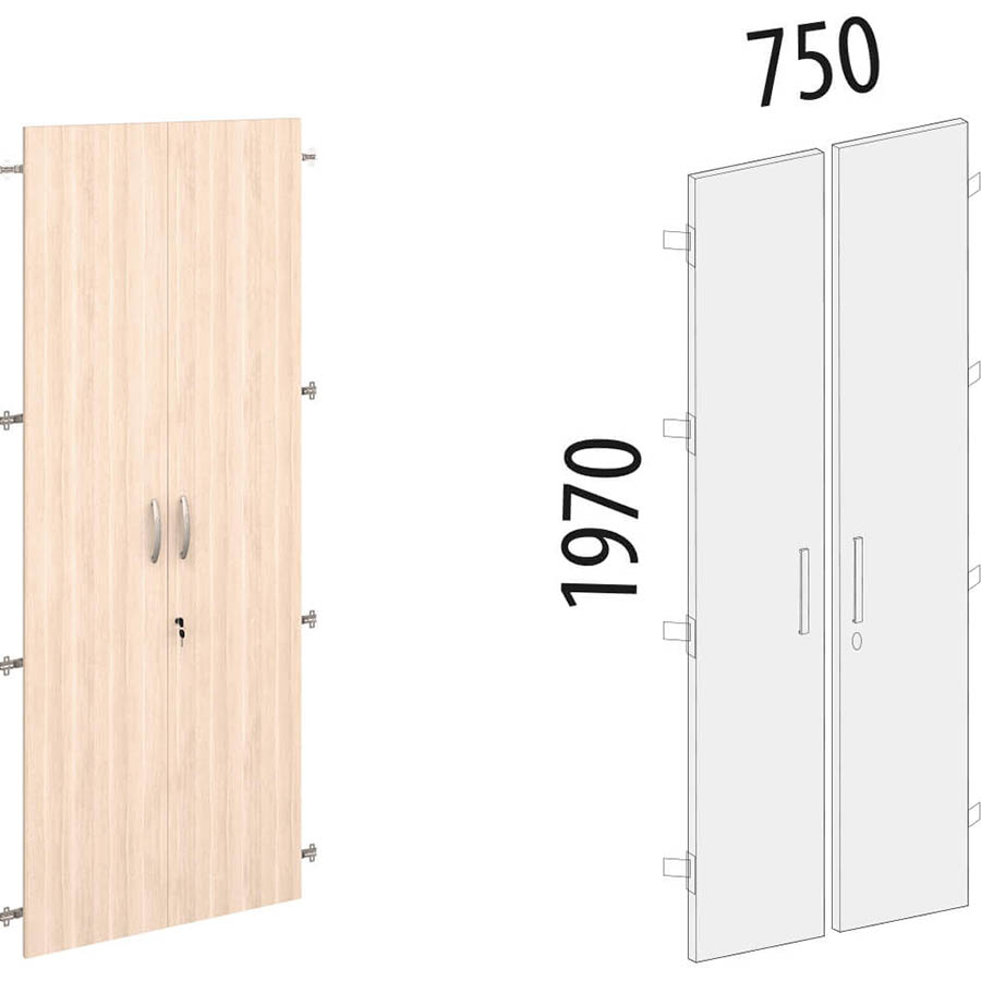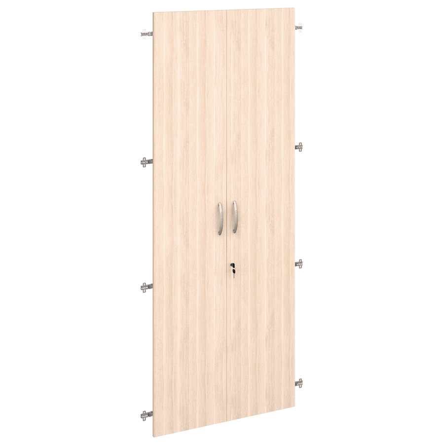 Двери ЛДСП 5 секций с замком «Альфа 63.58» являются частью модульного набора мебели для офиса «Альфа». Двери предназначены для комплектования стеллажей шириной 760 мм. Замок обеспечивает безопасное хранение вещей. Металлические ручки подчеркивают современный дизайн модели.