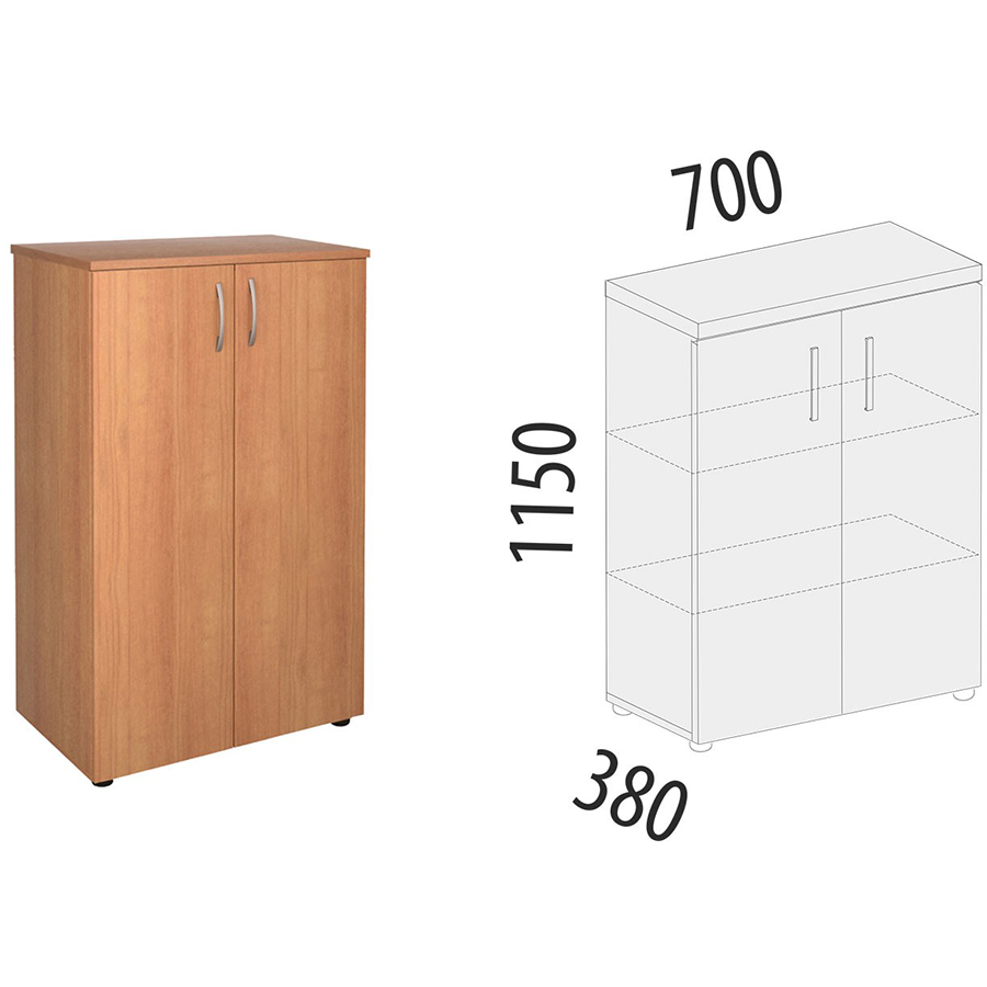 Шкаф «Рубин 42.75» является частью модульного набора мебели для офиса «Рубин». Модуль разделён полками на три секции и укомплектован дверями ЛДСП. Регулируемые по высоте ножки позволяют при установке компенсировать возможные неровности пола.